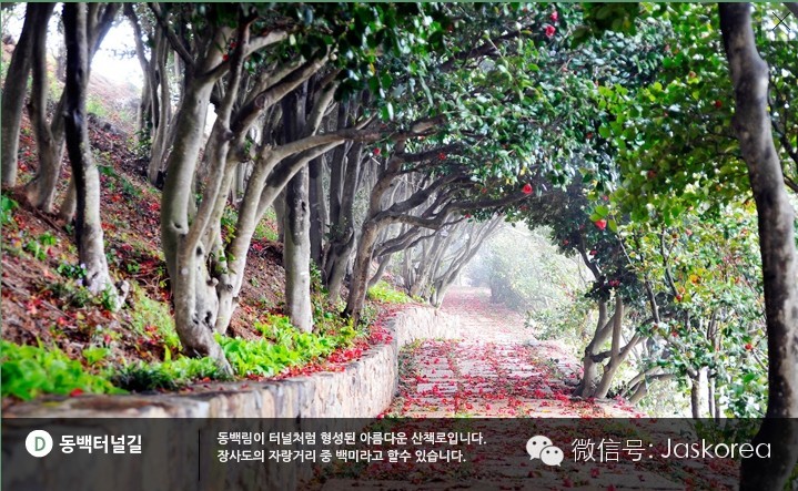都叫兽和千颂伊掉落的这个地方就是长蛇岛海上公园的代表性的景点“冬柏隧道路”。每年的11月到第二年4月冬栢花都会在这里盛开,成为游客们最爱拍照的景点之一。